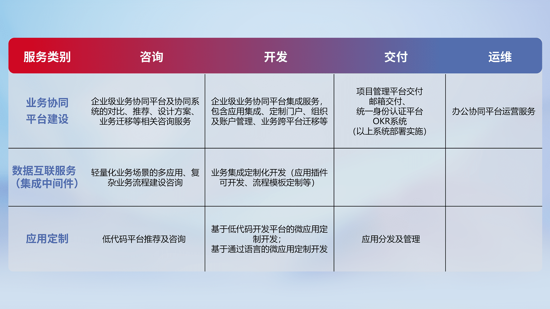针对钉钉、、、企微、、、IDaas等平台级产品提供产品的规划、、方案、、、、交付、、、、定制化开发等服务,,实现如统一协同办公、、智能客户服务、、、、混合会议管理、、、智能数据查询、、等业务场景,,实现数字化转型。。。